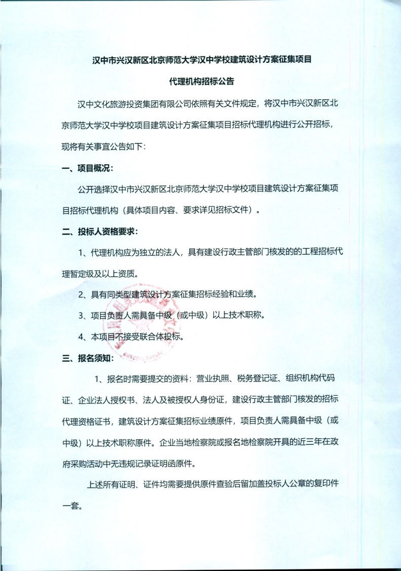 漢中文化旅游投資集團(tuán)有限公司依照有關(guān)文件規(guī)定,將漢中市興漢新區(qū)北京師范大學(xué)漢中學(xué)校項(xiàng)目建筑設(shè)計(jì)方案征集項(xiàng)目招標(biāo)代理機(jī)構(gòu)進(jìn)行公開招標(biāo),現(xiàn)將有關(guān)事宜公告如下: