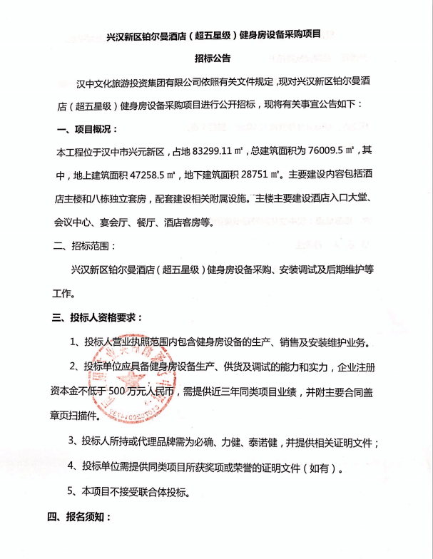 漢中文化旅游投資集團(tuán)有限公司依照有關(guān)文件規(guī)定,現(xiàn)對興漢新區(qū)鉑爾曼酒店(超五星級)健身房設(shè)備采購項(xiàng)目進(jìn)行公開招標(biāo),現(xiàn)將有關(guān)事宜公告如下: