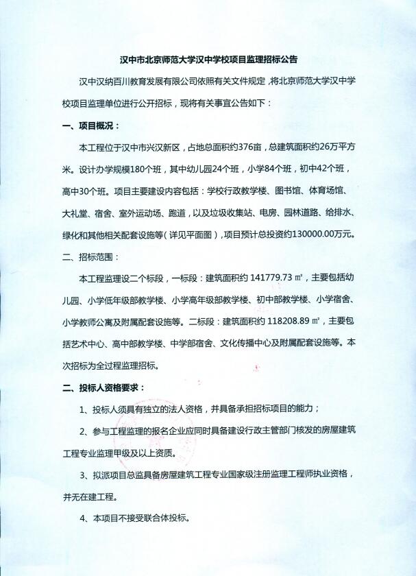 漢中市北京師范大學(xué)漢中學(xué)校項(xiàng)目監(jiān)理招標(biāo)公告