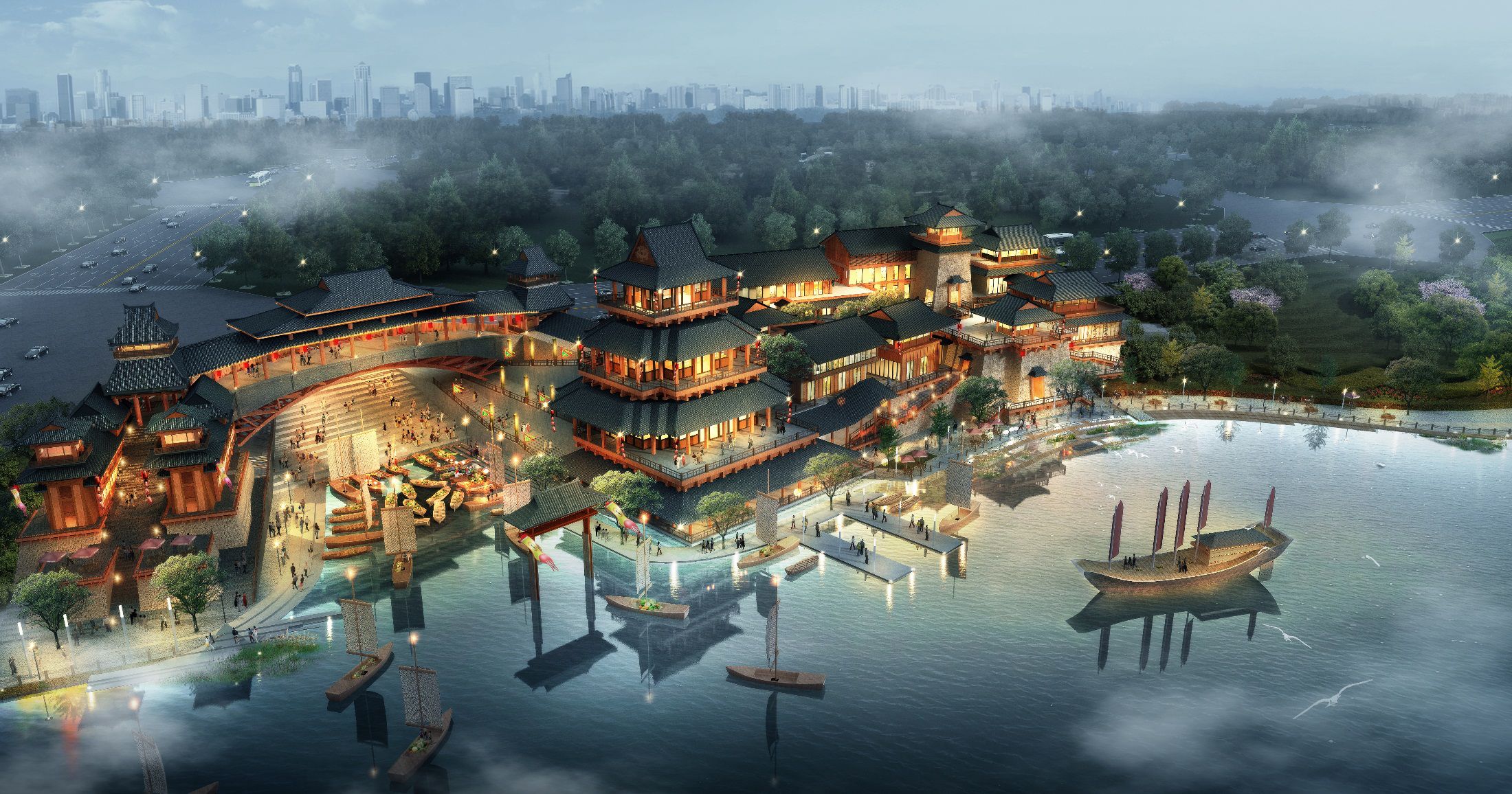 設(shè)計理念以“楚風漢韻”貫穿整個規(guī)劃設(shè)計過程,主要建筑以古蘭臺、子胥臺、陽春臺、白雪樓為借鑒,在白雪樓可遠眺漢宮,近看河景。