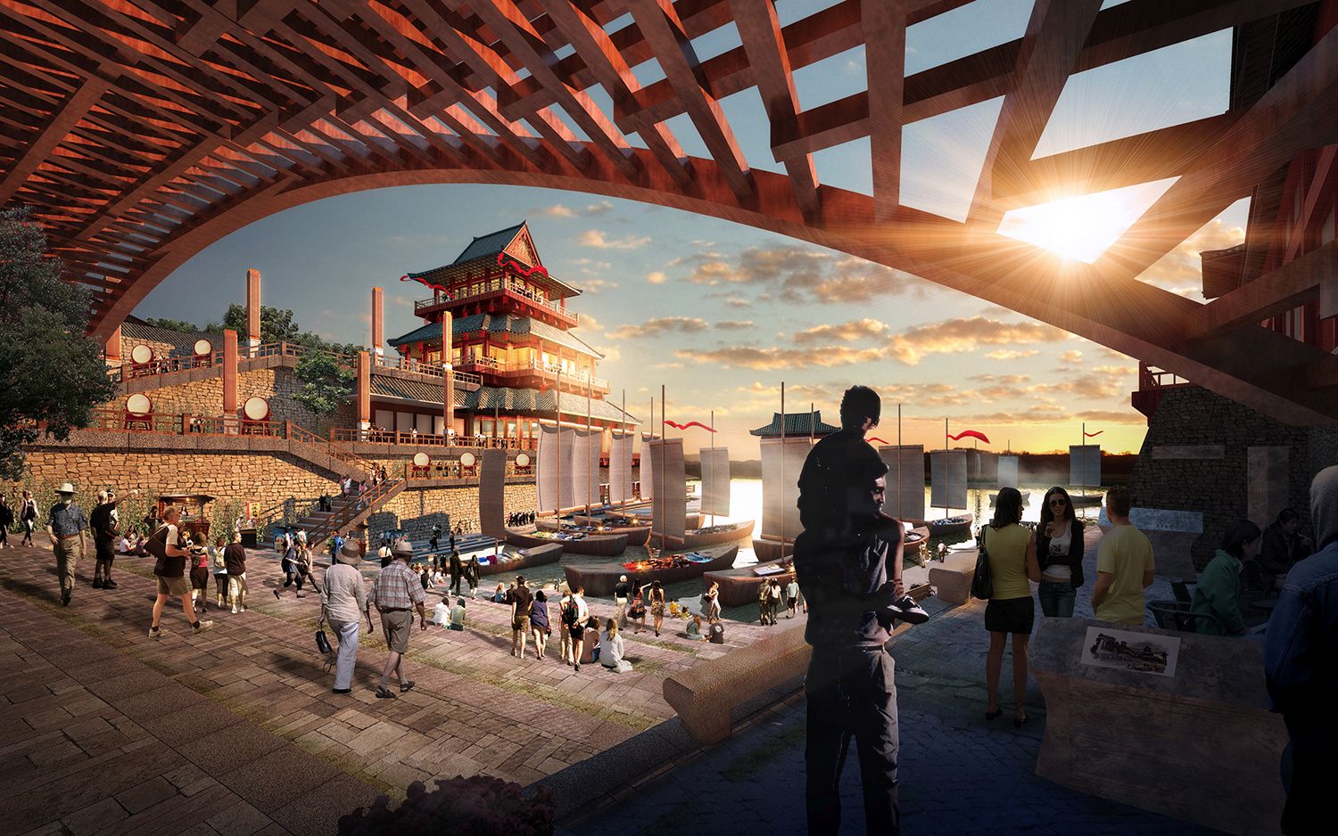 “一帶”是從東到西橫貫在區(qū)域中部的一條13公里長的河道,即“漢水文化東西河帶”。水面寬度從60米到300米,能夠通行特制的漢文化樓船及生態(tài)旅游水上巴士,沿線分段串聯(lián)8個“文化生態(tài)碼頭及休閑水岸商業(yè)區(qū)”,帶動沿線社區(qū)均衡發(fā)展。