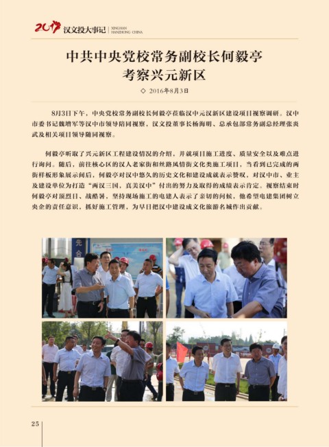 8月3日下午,中央黨校常務(wù)副校長(zhǎng)何毅亭蒞臨漢中元漢新區(qū)建設(shè)項(xiàng)目視察調(diào)研。漢中 8月10日上午,漢中市召開(kāi)非公有制經(jīng)濟(jì)人士?jī)?yōu)秀中國(guó)特色社會(huì)主義事業(yè)建設(shè)者表彰大會(huì),