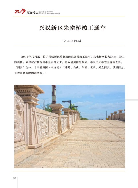 2016年12月底,位于興漢新區(qū)儻駱路的朱雀橋竣工通車(chē)。朱雀橋全長(zhǎng)為54m,為三